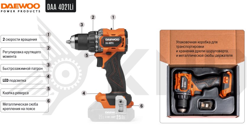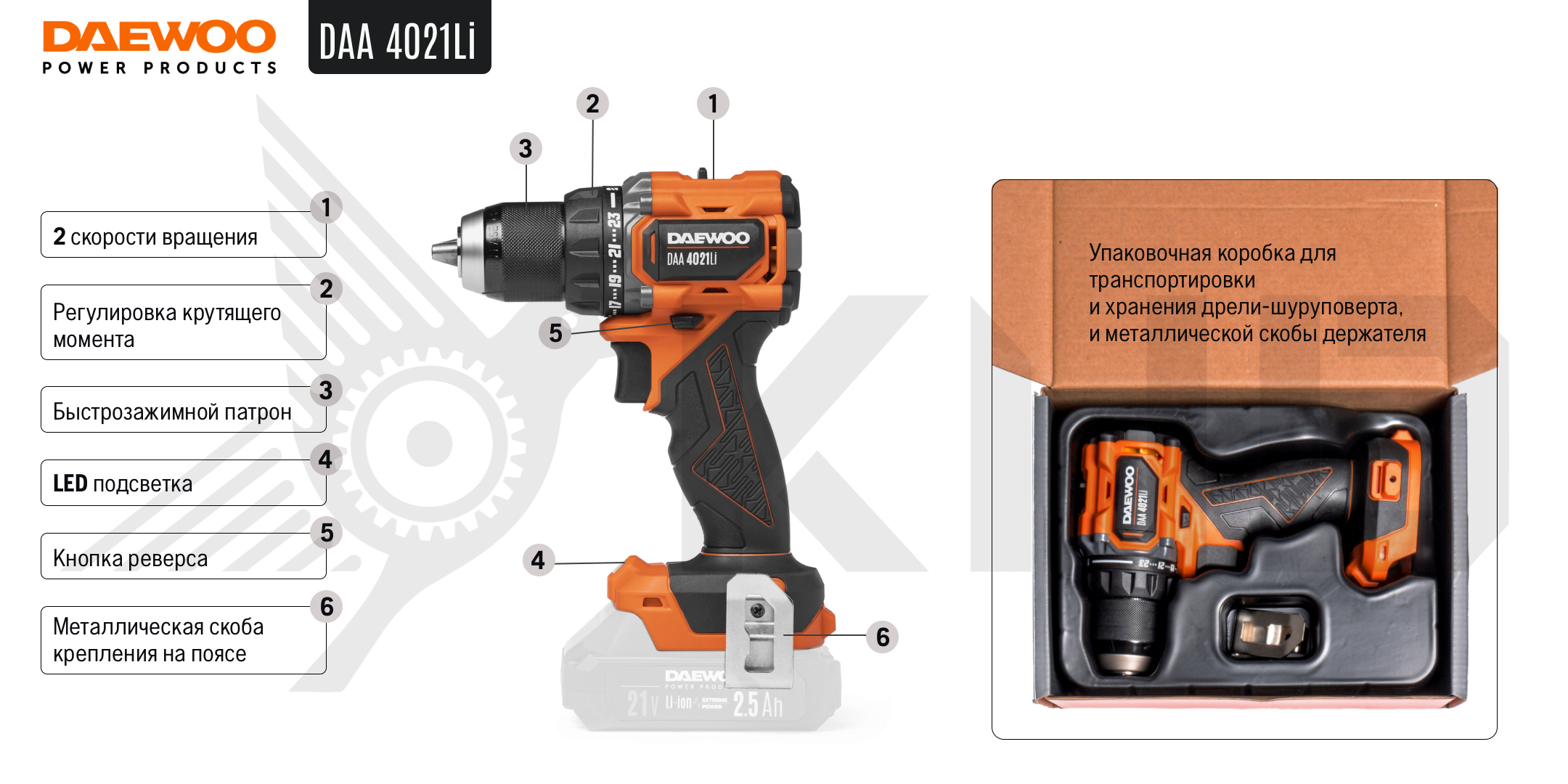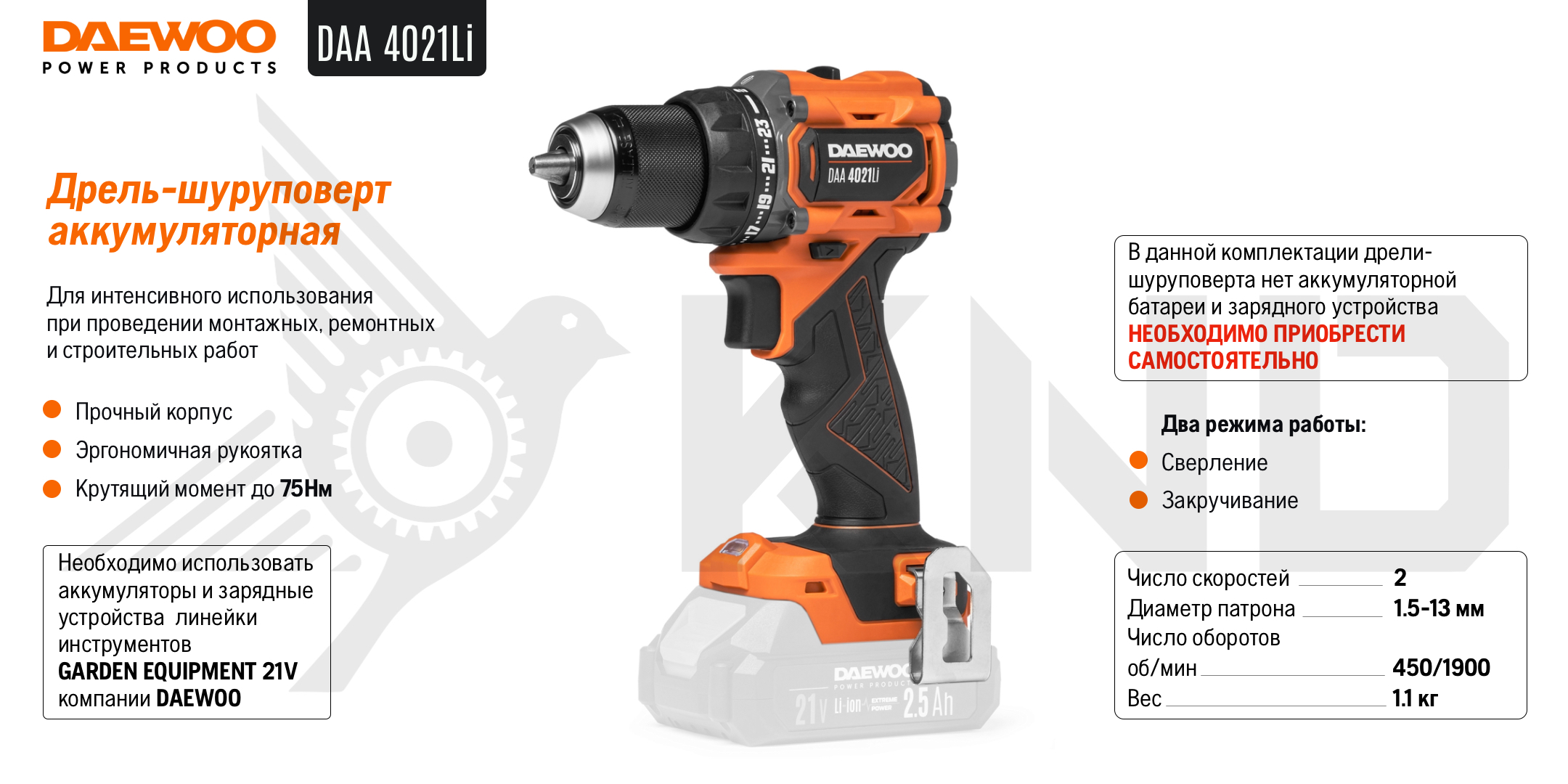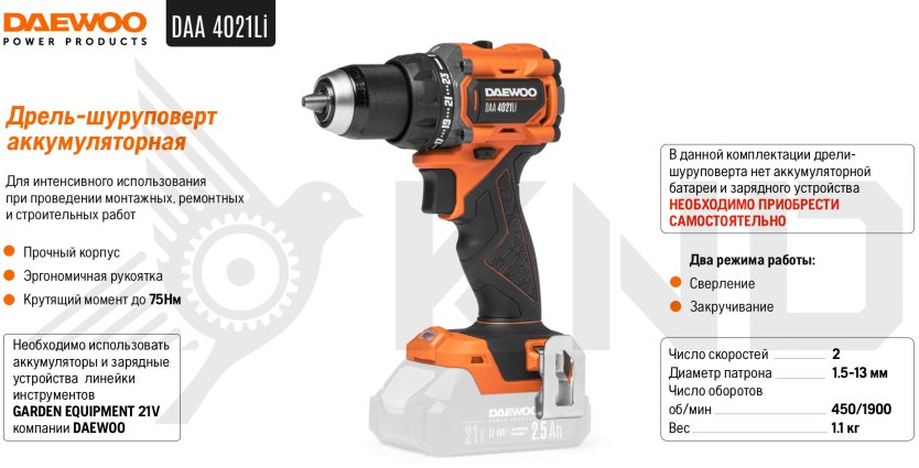 Модель совместима со всеми аккумуляторными инструментами и батареями DAEWOO линейки 21В.