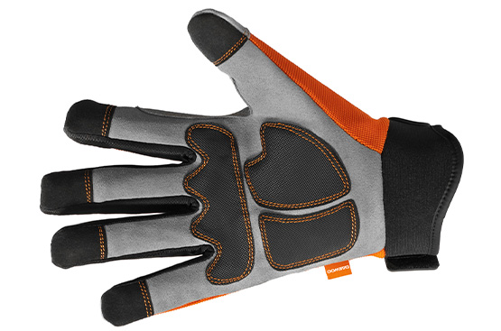 Удобный крой, эластичные материалы и ребристая поверхность защитных накладок позволяют надежно удерживать инструмент в руке и работать продолжительное время без ощущения дискомфорта.