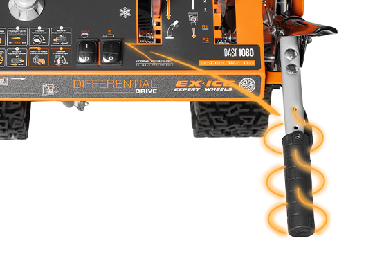 Автоматический дифференциал позволяет без усилий маневрировать снегоуборщиком на любых поверхностях, перебрасывая крутящий момент между колесами в зависимости от условий работы. При необходимости дифференциал можно разблокировать с помощью специального рычага.
