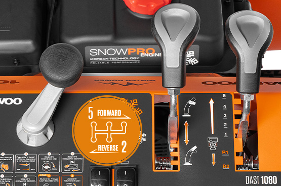 Система обеспечивает выбор скоростей: 5 скоростей вперед и 2 скорости назад, в зависимости от высоты снежного покрова. Простая и одновременно надежная система перемещения фрикционного диска для изменения скорости.