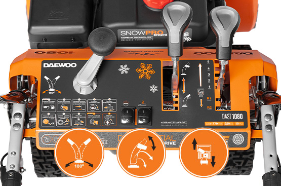 Панель управления с системой изменения скорости передвижения, направления и дальности выброса снега обеспечивает комфортное управление и работу со снегоуборщиком.
