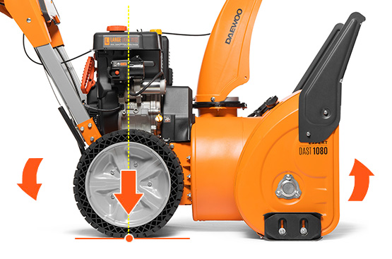 Основной вес снегоуборщика приходится на ось колес, что гарантирует лучшее сцепление с поверхностью. Такая развесовка предоставляет оператору легкость маневрирования и лучшую проходимость в классе