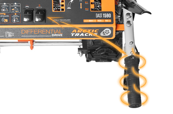 Автоматический дифференциал позволяет без усилий маневрировать снегоуборщиком на любых поверхностях, перебрасывая крутящий момент между колесами в зависимости от условий работы. При необходимости дифференциал можно разблокировать с помощью специального рычага.