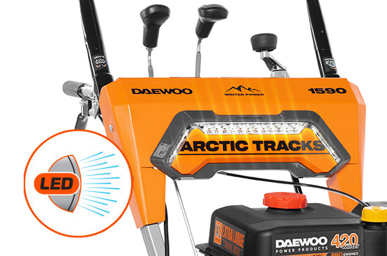 Яркая LED фара мощностью светового потока 280 лм обеспечивает освещение рабочей зоны перед снегоуборщиком, помогая работать в темное время суток.