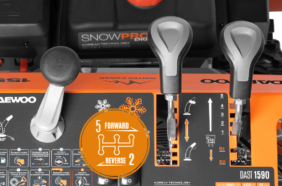 Система обеспечивает выбор скоростей: 5 скоростей вперед и 2 скорости назад, в зависимости от высоты снежного покрова. Простая и одновременно надежная система перемещения фрикционного диска для изменения скорости.