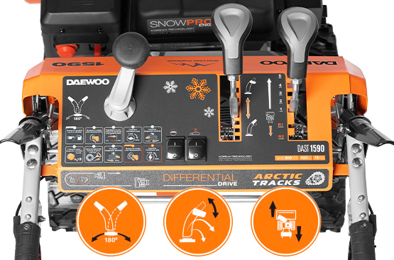 Панель управления с системой изменения скорости передвижения, направления и дальности выброса снега обеспечивает комфортное управление и работу со снегоуборщиком.